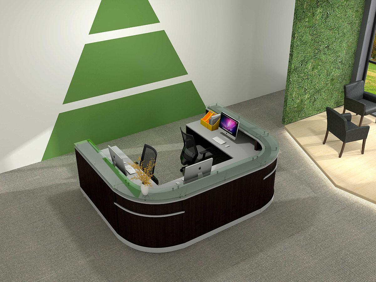 | NRC2416-2 | 31.5*31.5″ Curved Wood Glass Reception Counters | 32″W*32″D*41″ | W800*D800*H1050 | Drift/Mahogany/Mocha/White/Steeely Gray/Cordova Brown/Silver accent | Melamine | |
