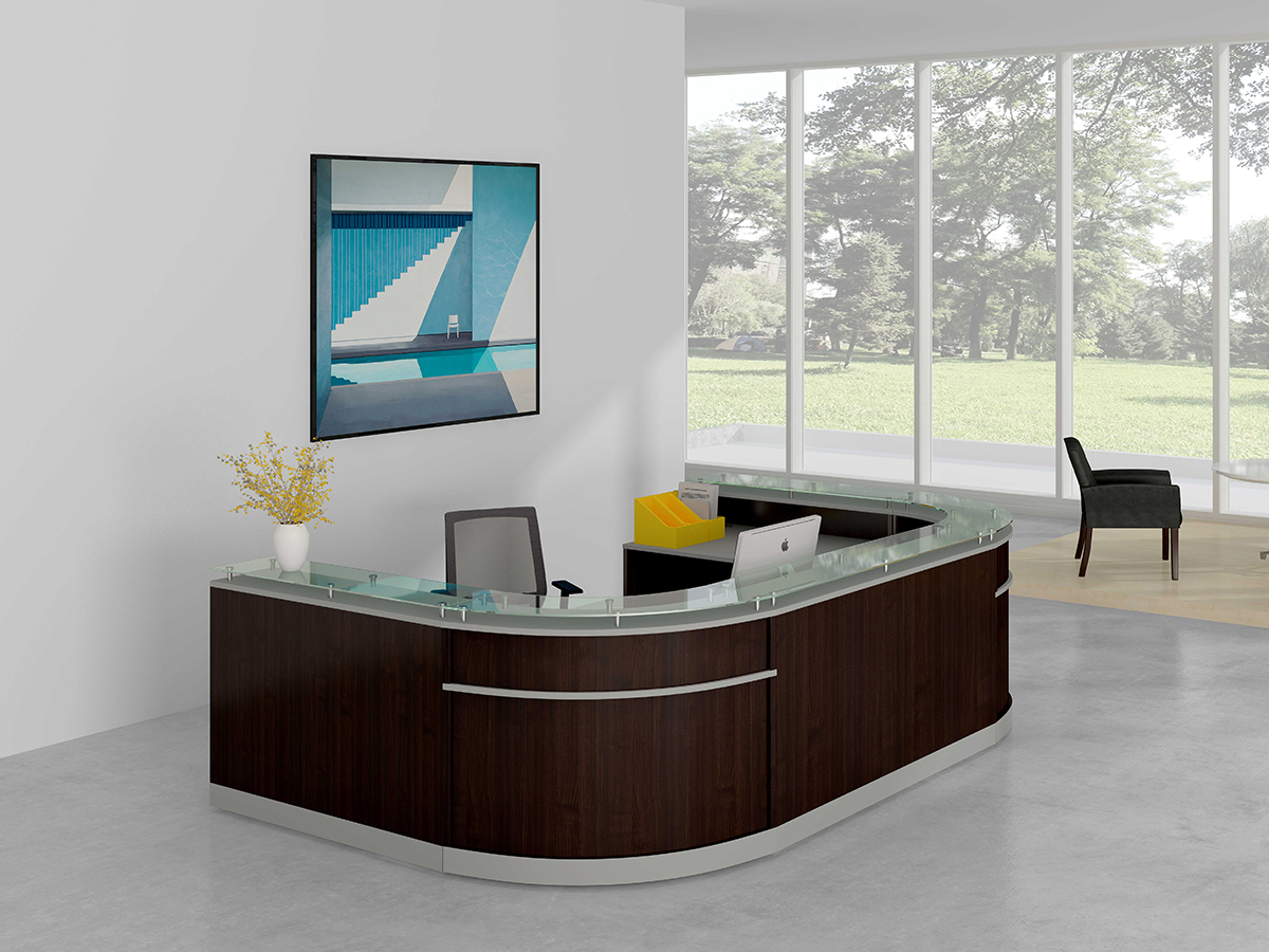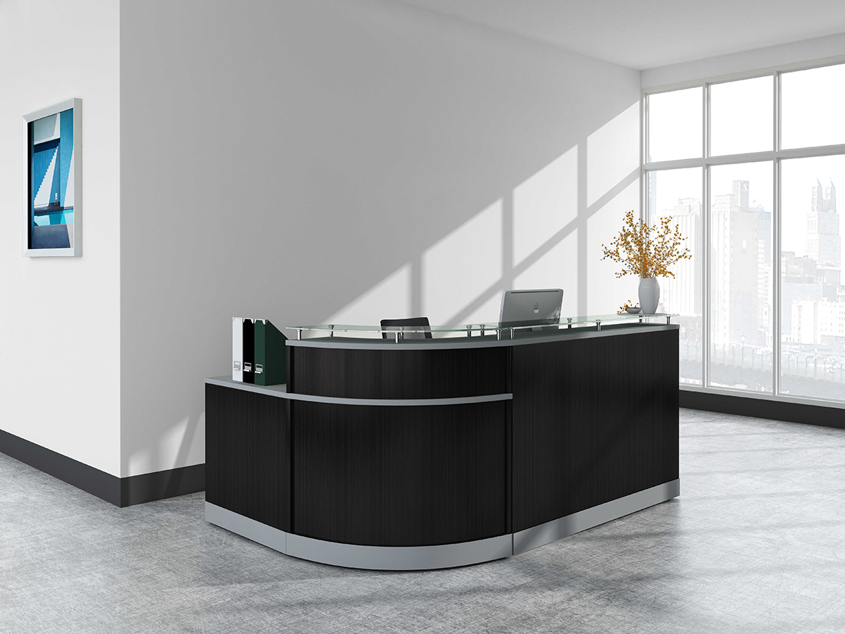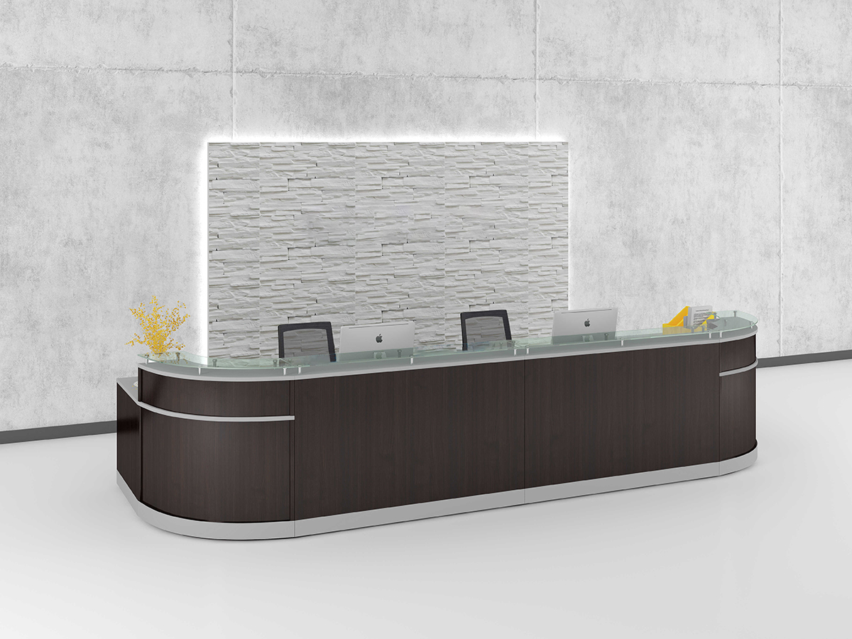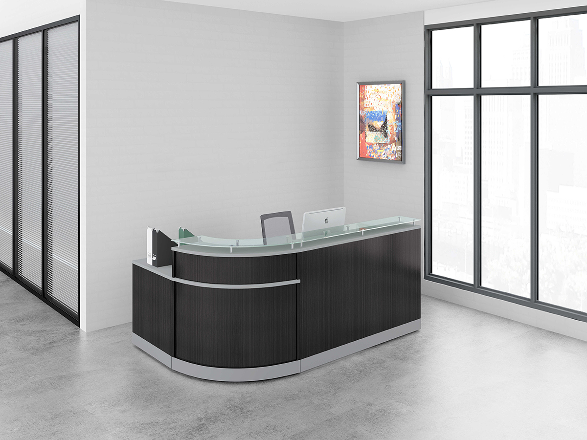 Features a floating glass countertop, providing a surface for guest transactions and 48″ or 63″ straight desks.
